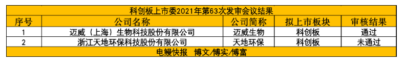 9月3日,上海证券交易所科创板上市委员会召开2021年第63次上市委员会审议会议,此次会议上审核了迈威(上海)生物科技股份有限公司(以下简称“迈威生物”)、浙江天地环保科技股份有限公司(以下简称“天地环保”)的首发上市申请。其中天地环保未能通过,迈威生物闯关成功。