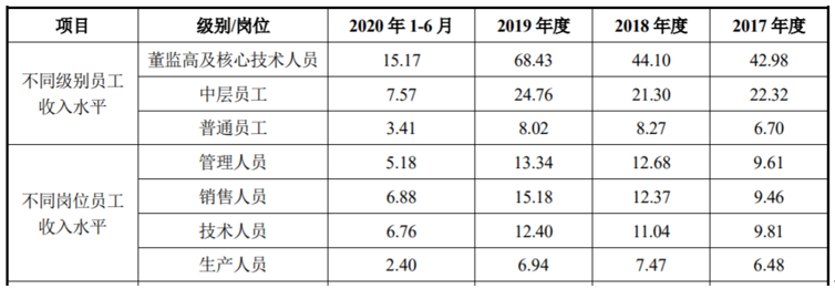 此外,根据招股书披露,梦天家居的生产人员人数多达1838人,与此同时招股书第357页披露,2020年上半年梦天家居的直接人工成本仅为4107.37万元,由此计算公司的生产人员在2020年上半年的人均薪酬仅为2.23万元、月均不到四千元,相比以前年度还明显下降;而且这还是包含了由企业承担的社保、住房公积金等成本,则梦天家居的生产人员人均到手薪酬已不足每月3000元,推算已经低于浙江省全社会单位制造业就业人员年平均工资(2019年为6.2万元)。