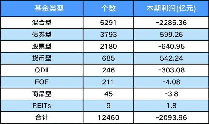 权益基金再度成为亏损主力军,股票型基金和混合型基金合计亏损达到2926.31亿元。不仅仅是权益基金,QDII、FOF和商品基金均呈现负收益,其中QDII基金亏损303.08亿元,FOF和商品基金分别亏损4.08亿元和3.8亿元。
