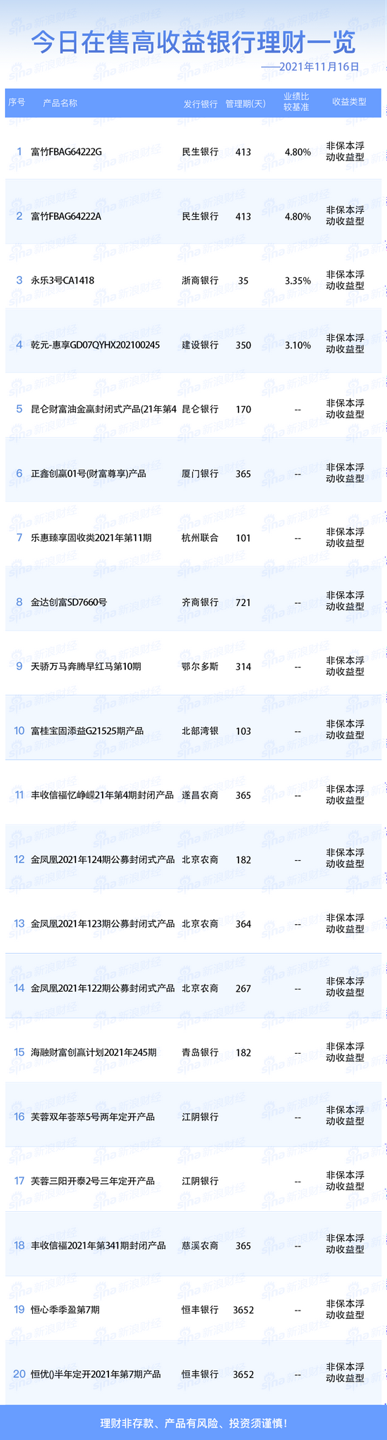 11月16日在售高收益银行理财产品:今日业绩比较基准在3.10%以上的银行人民币理财产品共4款。民生银行(3.930, 0.00, 0.00%)的“富竹FBAG64222G”业绩比较基准最高,为4.80%。