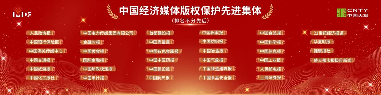 今年,获得版权保护先进集体奖的媒体单位(排名不分先后)有:人民政协报、中国银行保险报、中国冶金报、中国交通报、中国旅游报、中国化工报、中国电力传媒集团有限公司、金融时报、中国黄金报、国际金融报、中国邮政快递报、中国审计报、中国质量报、中国有色金属报、中国中医药报、中国建设报、中国航天报、中国档案报、中国海关传媒中心、中国纺织报、中国气象报、中国铁道建筑报、中国食品安全报、中国食品报、中国科学报、中国信息报、中国工业报、人民邮电报、首都建设报、上海证券报、21世纪经济报道、华夏时报、健康报社、楚天都市报极目新闻等34家。