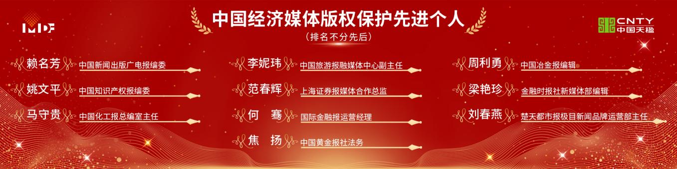 获得版权保护先进个人奖(排名不分先后)的有:中国新闻出版广电报编委赖名芳、中国知识产权报编委姚文平、中国化工报总编室主任马守贵、中国旅游报融媒体中心副主任李妮玮、上海证券报媒体合作总监范春辉、国际金融报运营经理何骞、中国黄金报社法务焦扬、中国冶金报编辑周利勇、金融时报社新媒体部编辑梁艳珍、楚天都市报极目新闻品牌运营部主任刘春燕等10人。