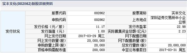 根据交易所公告,实丰文化发展股份有限公司于2017年3月29日进行网上申购。公司本次公开发行股票数量为2,000万股,网上发行2,000万股,占本次发行总量的100%。本次发行的股票无流通限制及锁定安排。