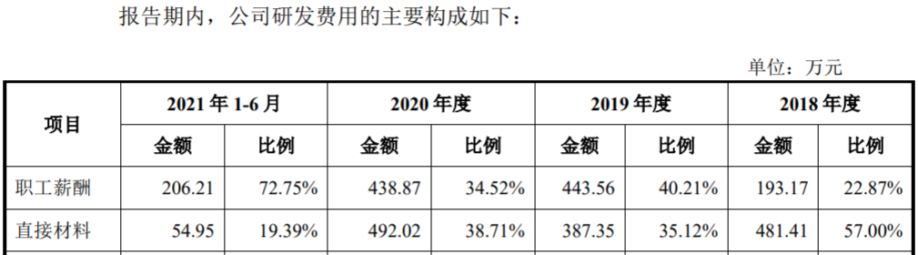 不仅如此,根据招股书披露,截止到2021上半年里得电科的研发人员人数为52人,相比2020年末的49人还净增加了3人;与此同时,2021上半年研发费用中包含的职工薪酬仅为206.21万元,对应公司研发人员人均薪酬尚不足4万元,折算每月人力成本尚不足7千元,这对于研发岗位人员薪酬标准是否合理是值得拷问的。