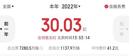 据猫眼专业版消息,截至2022年1月29日13:53,2022年度电影票房(含预售)破30亿元。