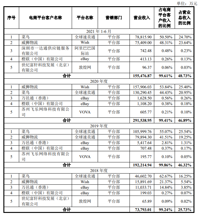 值得注意的是,在燕文物流的客户中电商平台客户如威狮物流、菜鸟等公司占据主要份额。报告期内电商平台客户收入占比分别为25.73%、46.32%、46.89%和48.73%,燕文物流对电商平台客户的依赖度较高。