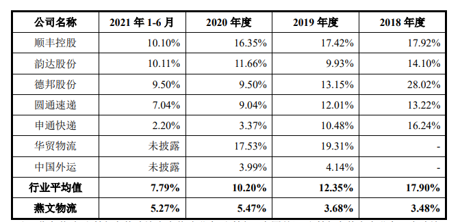 报告期内,公司主营业务毛利率分别为3.48%、3.68%、5.47%和5.27%,主营业务国际快递全程业务2021年前半年相较于2020年呈下降趋势,下跌2.54%。同时期可比上市公司主营业务毛利率平均值分别为17.90%、12.35%、10.20%和5.27%,燕文物流毛利率长期远低于同行业可比公司平均值。