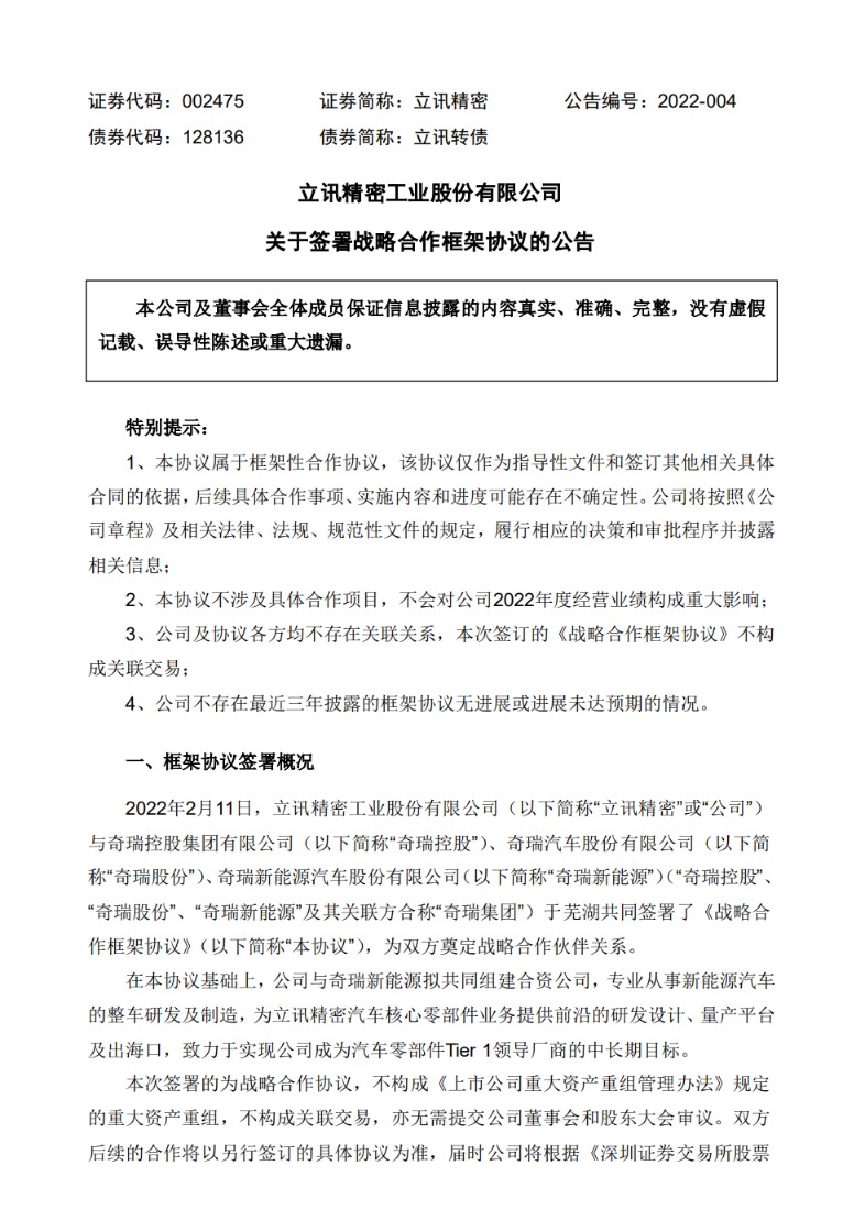 2月11日,立讯精密(002475.SZ)发布公告称,公司与奇瑞控股集团有限公司(以下简称奇瑞控股)、奇瑞汽车股份有限公司(以下简称奇瑞股份)、奇瑞新能源汽车股份有限公司(以下简称奇瑞新能源)于芜湖共同签署了《战略合作框架协议》(以下简称《协议》),正式成为战略合作伙伴关系。
