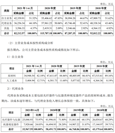 另据招股书披露,凌云光的主营业务按照不同模式划分为自主业务和代理业务,报告期内公司的代理业务收入分别为56562.69万元、64211.15万元、81798.55万元和43866.10万元,占主营业务收入的比例分别为 40.26%、44.89%、46.60%和 38.60%,针对该项业务招股书披露其内容为“从事境外知名品牌的光纤器件与仪器、视觉器件的代理业务”。