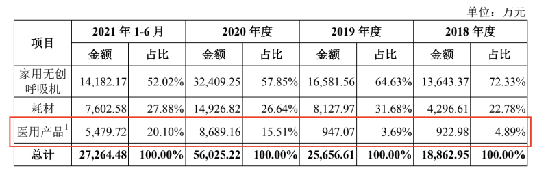 而新冠疫情的蔓延则导致怡和嘉业医用产品收入大幅上升,双水平肺病呼吸机、高流量湿化氧疗仪和全脸面罩等产品需求量激增,公司医用产品收入占比由2019年的3.69%,到2020年及2021年上半年提升至15.51%和20.1%。