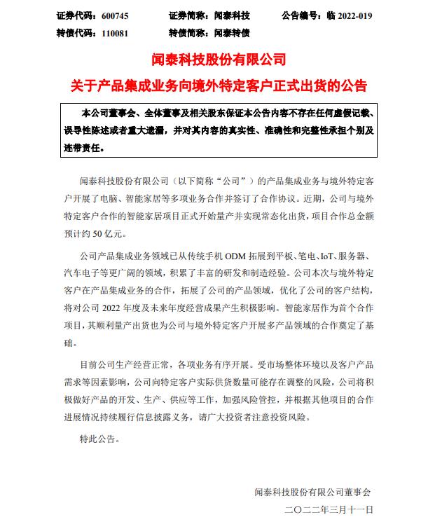 3月10日晚间,闻泰科技公告称,公司的产品集成业务与境外特定客户开展了电脑、智能家居等多项业务合作并签订了合作协议。近期,公司与境外特定客户合作的智能家居项目正式开始量产并实现常态化出货,项目合作总金额预计约50亿元。中国证券报记者从供应链人士处独家获悉,闻泰科技提到的境外特定客户指苹果公司,其中仅智能家居一个项目合作金额就有约50亿元,已经开始向苹果量产出货。