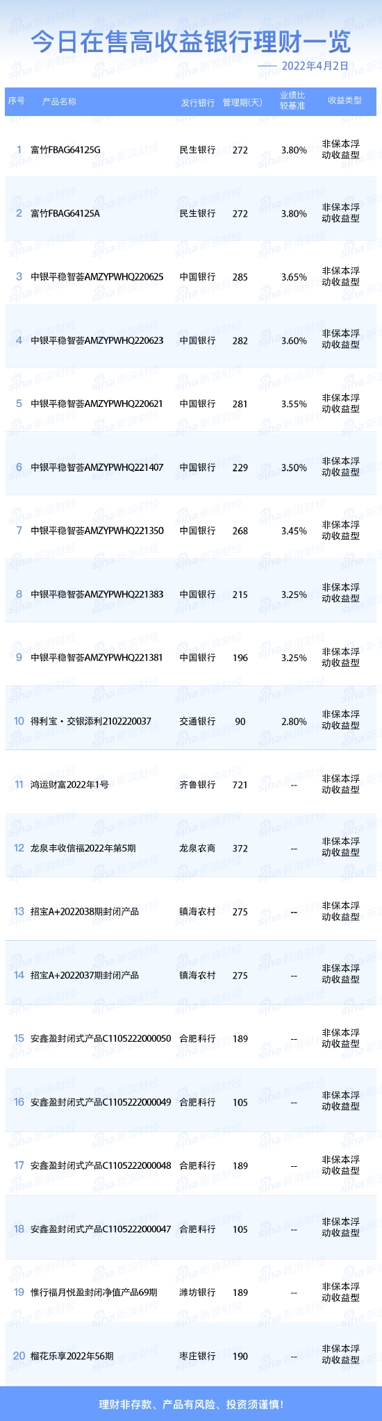 4月2日在售高收益银行理财产品一览。今日业绩比较基准在2.80%及以上的银行人民币理财产品共10款。理财非存款、产品有风险、投资须谨慎!
