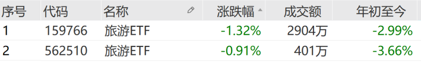 场内基金方面,多只旅游ETF跌1%或跌近1%。拉长时间来看,两只旅游ETF今年以来较为抗跌,年初至今跌幅在4%以下。