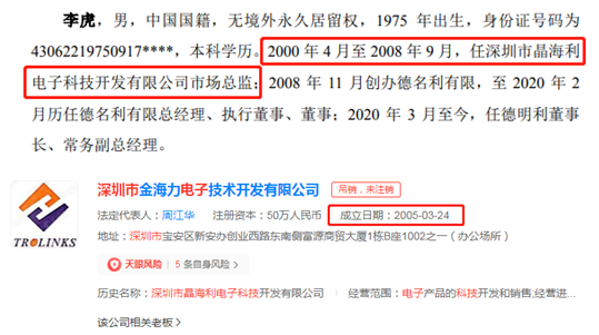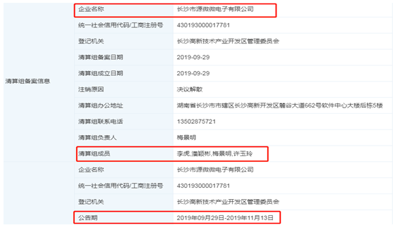 另外,天眼查信息还显示,李虎曾担任一家严重失信公司的大股东、经理。该公司名为长沙市源微微电子有限公司,成立于2008年7月,李虎持股35%,为第一大股东,同时是公司经理,2019年,公司被湖南省市场监督管理局列入严重违法失信企业名单。2020年1月,公司注销,此前李虎担任公司清算组成员。