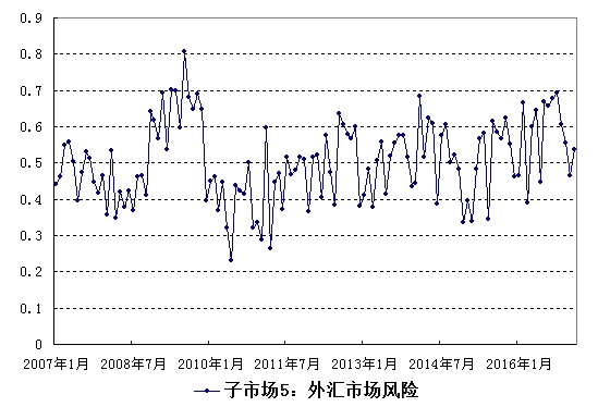 二、各子市场金融风险指数:金融机构经营风险和政府部门风险指数居于高位,股票市场和外汇市场金融风险指数平稳,债券市场风险指数居于低位,货币市场风险指数高位回落,房地产市场风险指数中位稳定。
