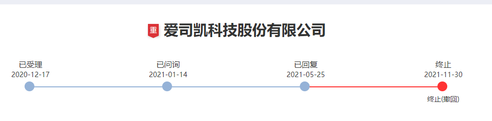 爱司凯于2020年12月17日受理,去年1月14日问询,在经历了2轮中止审核、3轮问询之后,2021年11月26日,爱司凯撤回了重大资产置换、发行股份购买资产并募集配套资金的申请文件。