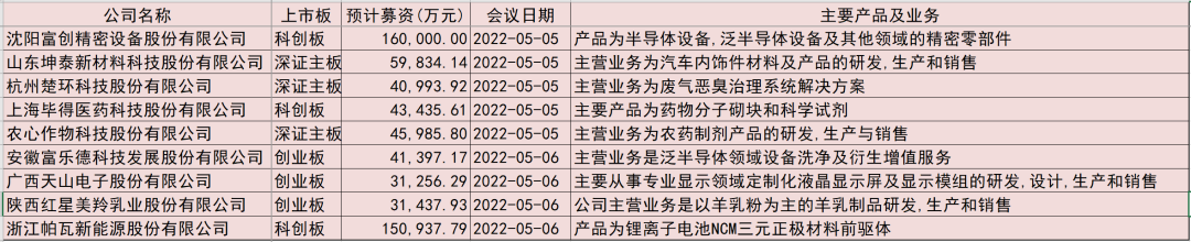 本周(5月5日到6日)虽然只有两个交易日,但仍有9家公司IPO上会,其中创业板3家,科创板3家,深证主板3家,预计募资金额合计达61亿元。其中拟募资16亿元冲刺科创板的富创精密,是全球为数不多的能够量产应用于7纳米工艺制程半导体设备的精密零部件制造商。