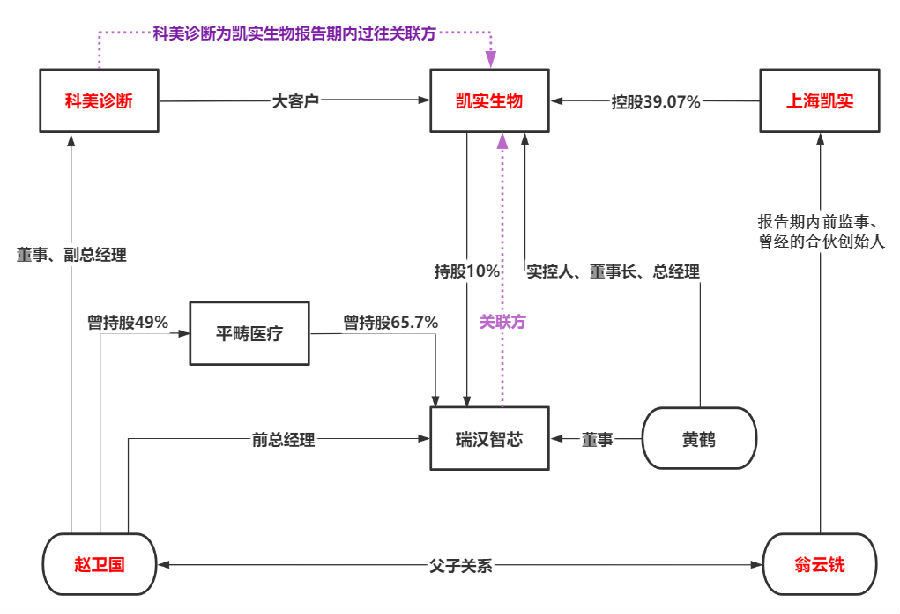 据悉,瑞汉智芯成立于2016年9月,是凯实生物的参股公司。2017年,凯实生物出资200万元参股投资瑞汉智芯(持股比例为10%),并委派其实控人、董事长、总经理黄鹤担任瑞汉智芯董事;工商信息显示,科美诊断董事、副总经理ZHAO WEIGUO亦在瑞汉智芯担任总经理一职。这一情况引发监管质疑,在科美诊断IPO首轮审核问询中,上交所要求公司说明“嘉兴凯实(即凯实生物,下同)的基本情况,与公司是否存在关联关系,是否与ZHAO WEIGUO任职的瑞汉智芯存在关联关系。”科美诊断则明确表示凯实生物与瑞汉智芯具有关联关系、和公司无关联关系。该公司表示,根据瑞汉智芯、嘉兴凯实的确认及网络检索瑞汉智芯、嘉兴凯实工商登记信息,公司董事ZHAO WEIGUO曾任瑞汉智芯的总经理并于2018年11月离任,但瑞汉智芯未及时就上述任职变化向原公司登记机关备案。截至本回复出具之日,嘉兴凯实是瑞汉智芯股东,持有瑞汉智芯10%股权;同时,嘉兴凯实实际控制人黄鹤担任瑞汉智芯的董事。