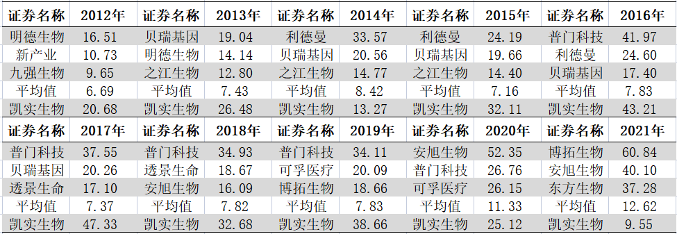 记者依据体外诊断行业公司(按照申万三级行业分类,下同)近十年销售数据统计发现,与业内公司第一大客户销售占比排名对比,凯实生物来自科美诊断的收入占比常年为行业平均值(业内公司针对第一大客户销售占比的算数平均值)数倍,其中2012年、2013年、2015年、2016年、2017年、2019年的销售占比均超过业内排名第一的公司,2018年超过业内排名第二的公司,2014年、2020年均超过业内排名第四的公司,仅2021年低于行业平均水平。