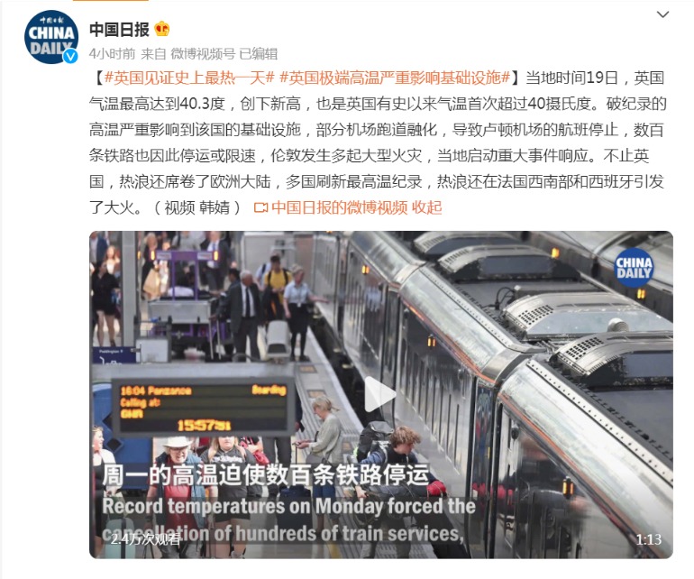 首次超过40°C!英国史上最热一天:机场跑道被“晒化” 数百条铁路停运、限速