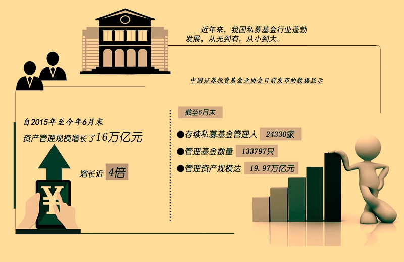 近年来,我国私募基金行业蓬勃发展,从无到有,从小到大。自2015年至今年6月末,资产管理规模增加了16万亿元,增长近4倍。中国证券投资基金业协会日前发布的数据显示,截至6月末,存续私募基金管理人24330家,管理基金数量133797只,管理资产规模达19.97万亿元。