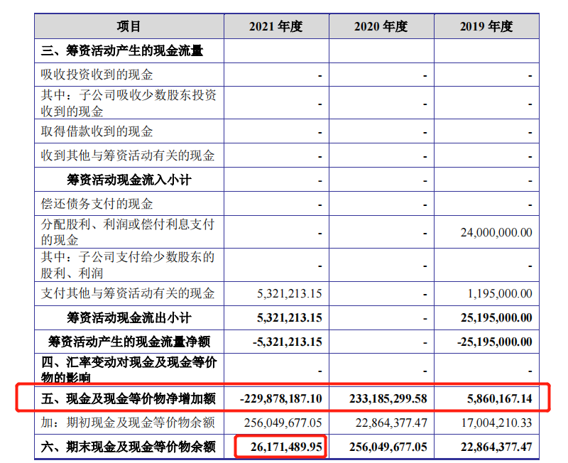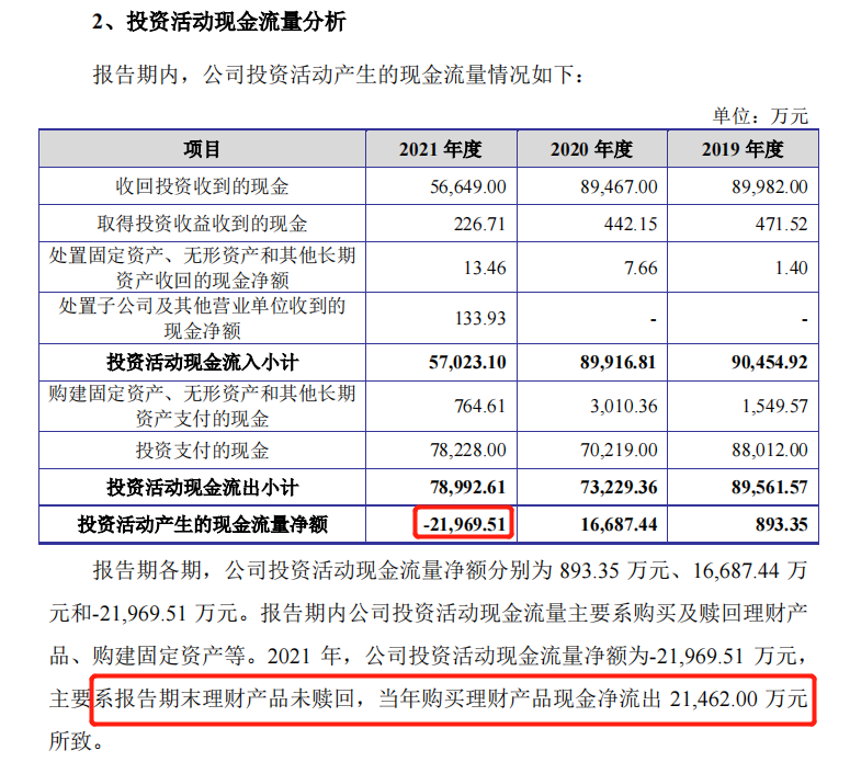 投资活动产生的现金净流出2.2亿元。招股书称,投资活动现金净流出主要是由于报告期末理财产品未赎回,当年购买理财产品现金净流出2.15亿元。2021年正是金智教育冲刺科创板的关键期,大笔购买理财产品不禁让人好奇,金智教育真的需要IPO融资吗?