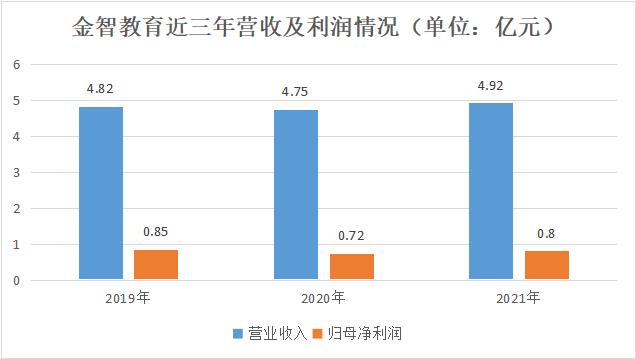2019年-2021年,金智教育分别实现营收4.82亿元、4.75亿元、4.92亿元,归母净利润8535.41万元、7158.35万元、8032.17万元。2020年业绩小幅下滑之后,尽管2021年营收和净利同比均有增长,但营收和2019年相比仅增加2%,净利甚至还未恢复到2019年水平。总体来看,金智教育近三年业绩没有明显增长。