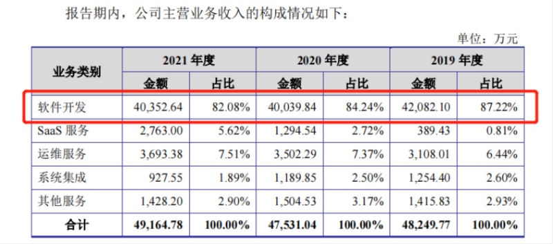 其中,软件开发收入为总营收贡献超过八成,是金智教育创收的主力军。但近三年该板块业务收入却没有太多起色,2020年软件开发收入同比下降4.85%至4亿元,2021年软件开发收入实现4.04亿元,和上年基本持平,但未恢复到2019年水平。对于2020年收入下降的原因,公司提到受疫情影响,国内高校推迟复工复学,以及疫情导致的项目验收进度推迟。但2020年新开普、佳发教育等同行业绩均有所增长,因此疫情“背锅”的托辞,似乎并不具备说服力。