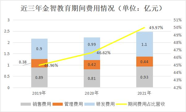 “开源”不足的情况下,也没能做好“节流”,近三年期间公司费用逐年上升。2019年-2021年,金智教育的期间费用分别为2.17亿元、2.22亿元、2.46亿元,占当期营收的比例为44.96%、46.62%、49.97%。对于2021年费用支出增长的原因,公司提到随着疫情防控进入常态化,公司逐步加大业务开拓力度,销售费用有所回升以及公司加大对平台化及SaaS产品研发投入。