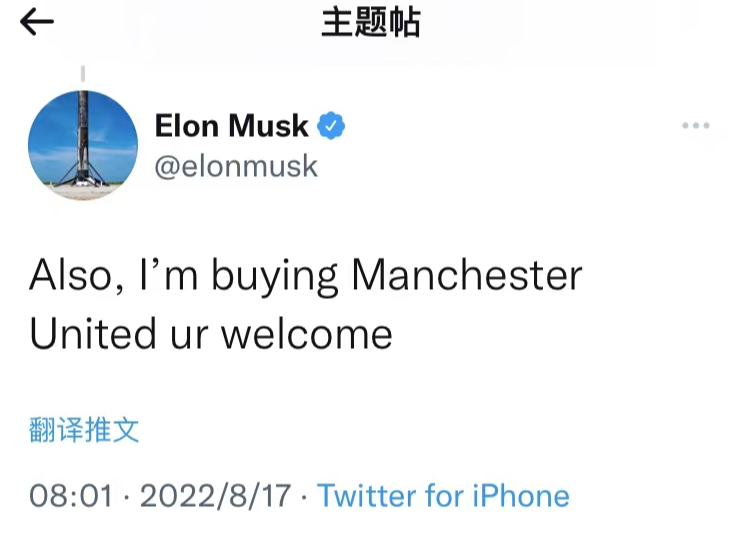 8月17日,特斯拉CEO马斯克在推特发文称,将收购英超俱乐部曼联。