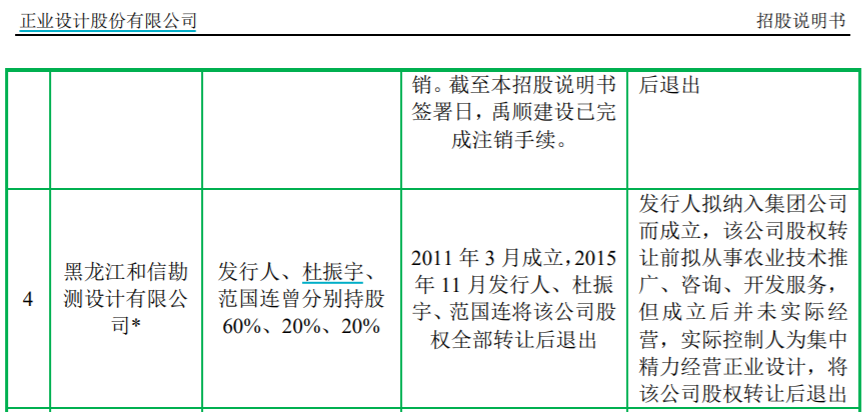 和信勘测原名为黑龙江农垦宏盛农业开发有限公司,设立于2011年3月,注册资本为 50 万元,当时还是正业设计实控人杜振宇投资设立子公司,从事农业技术推广、咨询、开发、服务,但该公司在成立后并未实际开展经营;后出于精简公司结构、专注公司勘察设计主营业务发展的考虑,正业设计决定将农垦宏盛进行剥离,转让后由赵丽艳和刘富独立经营和信勘测,并于2016年取得了工程勘察专业类(工程测量)乙级资质和农林行业(农业综合开发生态工程)专业乙级资质。