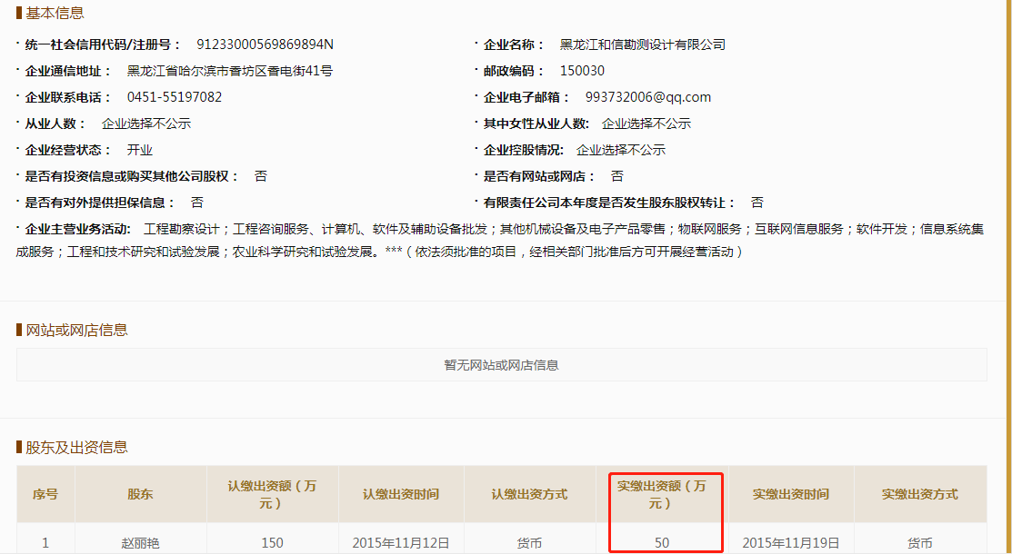 对此,正业设计在回复采访时坚称:“截止到2021年末,和信勘测的实缴资本并非50万元,员工人数也并非1人,和信勘测申请勘察设计工程测量乙级资质时注册资本、人员数量符合相应的资质标准规定。”但该公司的这种说法,与《国家企业信用信息公示系统》查询到的记录并不相符。