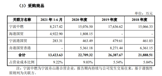 招股书披露,报告期内,公司向关联方采购的物资主要为船用燃料油。宁波远洋主要向宁波中燃购买内贸燃油;向舟港国贸香港、海港国贸购买外贸燃油;向宁波港国贸购买润滑油用于船舶设备机械的运行、维护等。