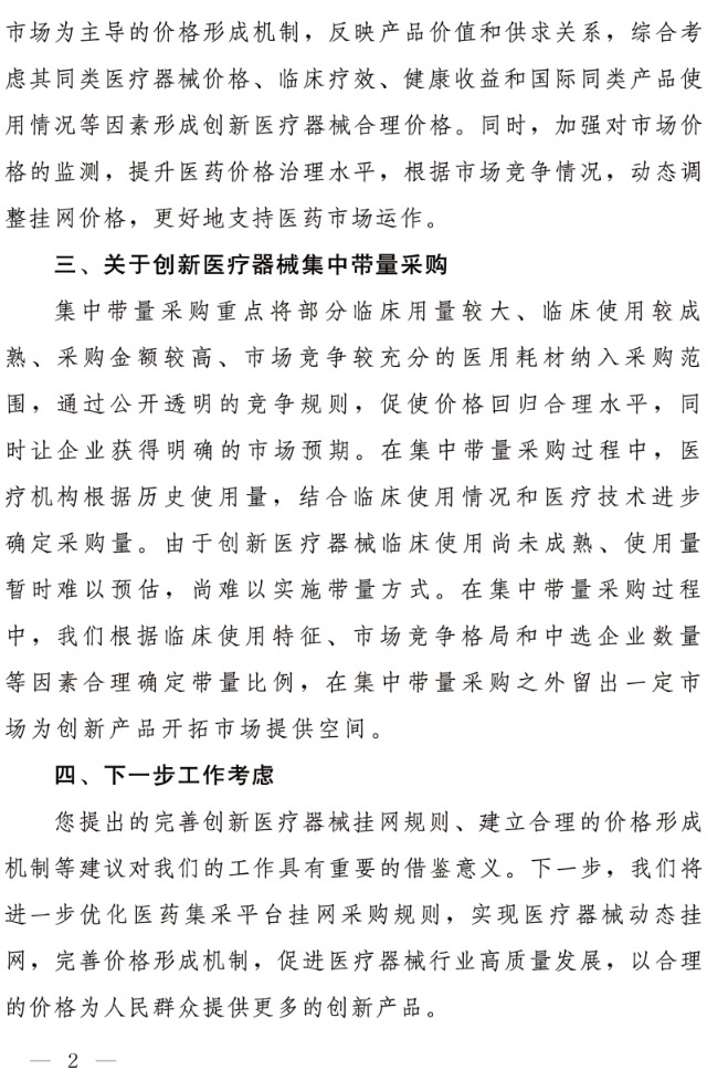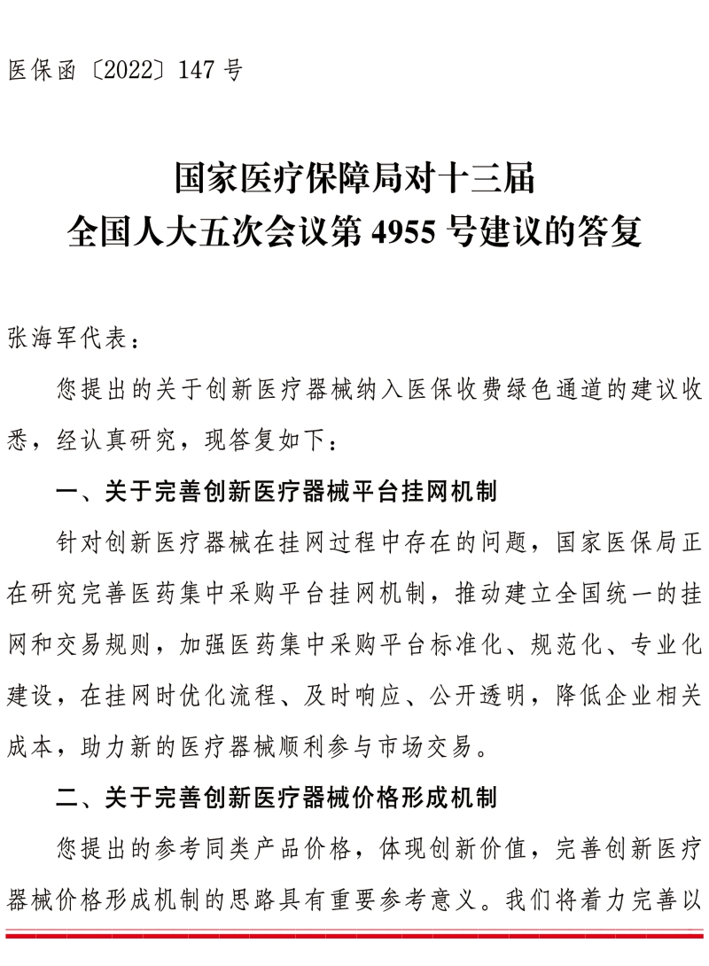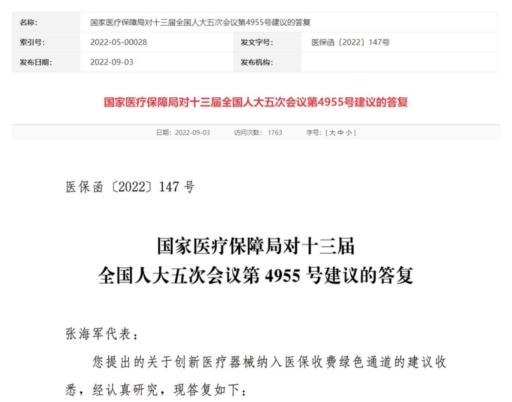 9月3日,医保局对外发布《国家医疗保障局对十三届全国人大五次会议第4955号建议的答复》。《答复》指出,在集中带量采购过程中,医疗机构根据历史使用量,结合临床使用情况和医疗技术进步确定采购量。由于创新医疗器械临床使用尚未成熟、使用量暂时难以预估,尚难以实施带量方式。在集中带量采购过程中,根据临床使用特征、市场竞争格局和中选企业数量等因素合理确定带量比例,在集中带量采购之外留出一定市场为创新产品开拓市场提供空间。