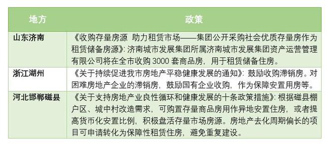 除了上述提及的济南,浙江湖州也推出过类似的政策。今年8月15日,浙江省湖州市房地产市场平稳健康发展联席会议办公室发布《关于持续促进我市房地产平稳健康发展的通知》提到,鼓励收购滞销房。对困难房地产企业的滞销房,鼓励国有企业收购,作为保障安置用房等。
