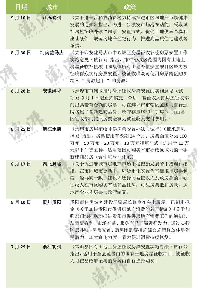 以江苏泰州为例,9月10日,“泰州发布”官方微信公众号发布消息显示,江苏省泰州市住建局等七部门联合印发《关于进一步释放消费潜力持续推进市区房地产市场健康发展的通知》,《通知》称,为进一步激发市场潜在动能,采取试行房屋征收补偿“房票”安置方式、优化土地供应节奏和出让条件、规范房地产经纪行为、推进高品质住宅建设等举措。