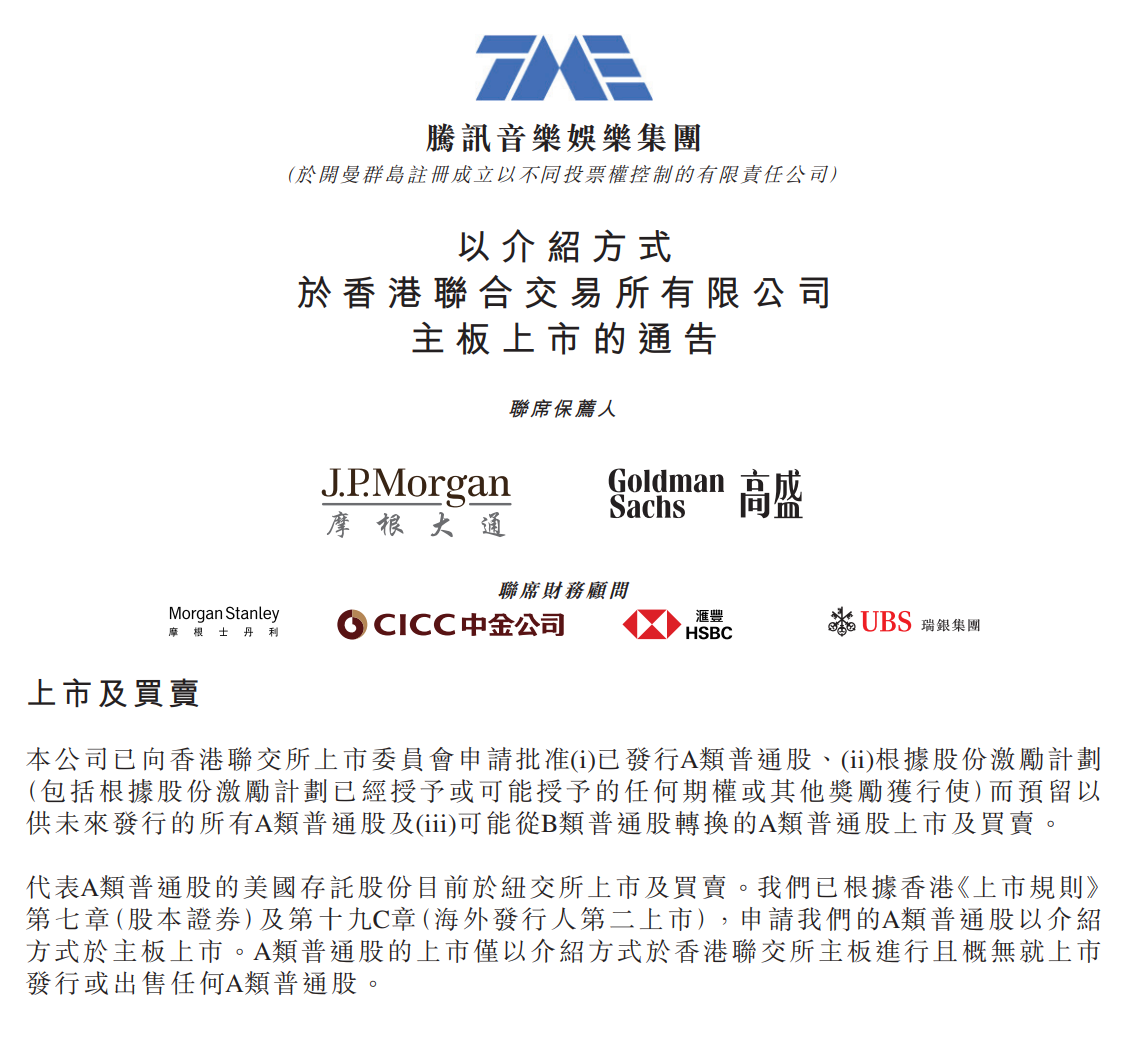 腾讯音乐在港交所公告称,将以介绍方式于香港联合交易所有限公司主板上市,A类普通股预期将于9月21日(星期三)开始在香港联交所买卖。