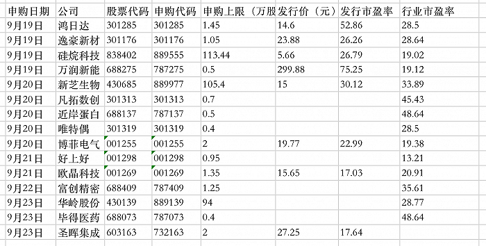 本周的申购,供应充足。9月19日(周一)有4家,分别是鸿日达(301285.SZ)、逸豪新材(301176.SZ)、硅烷科技(838402.BJ)、万润新能(688275.SH)。鸿日达从事精密连接器的研发生产销售,产品应用于手机及其周边产品、智能穿戴设备、电脑等3C领域。逸豪新材主要从事电子电路铜箔及其下游铝基覆铜板、PCB的研发、生产及销售。硅烷科技的主要产品为氢气(工业/高纯氢)与电子级硅烷气。万润新能主要产品涵盖磷酸铁锂正极材料及前驱体、锰酸锂正极材料等,该等材料系制造新能源汽车动力电池的核心材料,公司收入主要来源于磷酸铁锂正极材料的销售。万润新能的发行价高达299.88元。