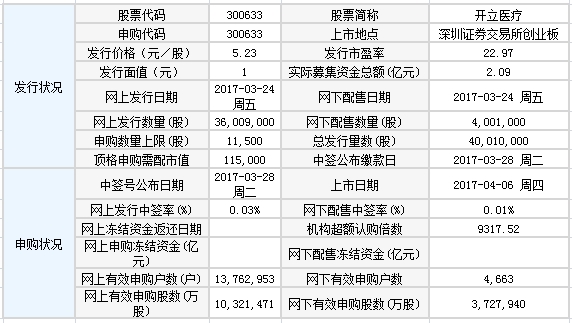 根据交易所公告,深圳开立生物医疗科技股份有限公司于2017年4月6日起在深圳证券交易所创业板上市。