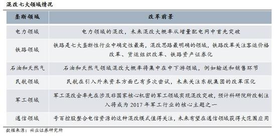 我们看好2017 年“混改”在电力、铁路、石油、天然气、民航、军工、电信七大行业中的持续性突破,其中建议投资者关注目前混改思路较明确、确定性较高的铁路、民航以及军工领域。具体推荐标的组合详见我们近期的国企改革专题。