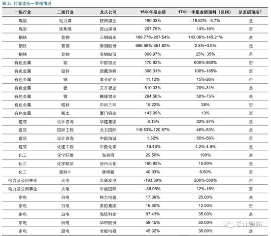 此外,从自下而上的角度,投资者四月份应关注一季报行情,在过去四年中,4月份一季报高增长公司超额收益分别为4.4%、2.5%、5.4%与6.8%,平均来看,月度超额收益为4.76%。由于目前一季报尚未开始披露,我们无法从自上而下角度去分析行业一季报情况,不过我们自下而上的收集了部分行业龙头一季报情况以及是否超预期。供各位投资者参考。