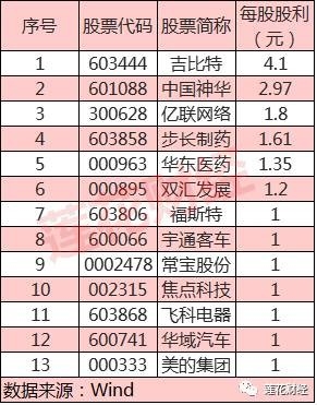 除了中国神华每股派息2.97 元之外,另有吉比特、亿联网络、步长制药、华东医药、双汇发展等12家公司每股派息1元及以上。然而,相对A股三千余家上市公司数量来看,占比仅1% .