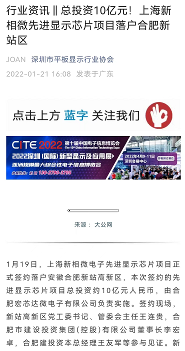 新相微表示显示驱动芯片市场供给短缺情形逐步缓解、终端需求下降,但仍在积极扩张。公开新闻显示,2022年1月19日,上海新相微电子先进显示芯片项目正式签约落户安徽合肥新站高新区,签约的先进显示芯片项目总投资约10亿元(人民币),由合肥宏芯达微电子有限公司负责实施。