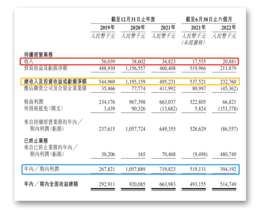 聆讯资料还透露,天图投资2019年、2020年、2021年及2022上半年分别实现投资收入5603.9万元、3860.2万元、3482.3万元、2088.1万元,录得总收入分别达5.45亿元、11.95亿元、4.95亿元及2.33亿元,分别实现纯利润2.68亿元、10.58亿元、7.2亿元、3.94亿元。
