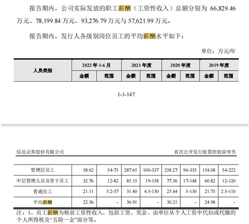 另外,在招股书中,信达证券还公布了公司员工人均薪酬情况。其显示,2021年度,公司人均薪酬为36.91万元,其中管理层员工的年薪范围为100万元~337万元,人均薪酬为287.65万元。中干及骨干员工的平均年薪为85.15万元,范围在19万元~158万元之间。普通员工平均薪酬31.4万元,范围在4.5万元~130万元之间。