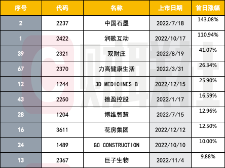 IPO首日收盘涨幅TOP10排名,中国石墨(02237.HK)和润歌互动(02422.HK)分别以143.08%和110.94%的涨幅位居第一和第二,成为了今年为数不多的打新亮点;首日收涨9.88%的巨子生物(02367.HK)排名第十。