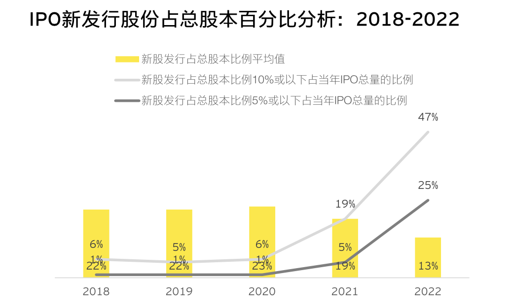 根据安永披露的数据,超过4成IPO新发股份占总股本比例在10%或以下,超2成IPO新发股份占总股本5%或以下。