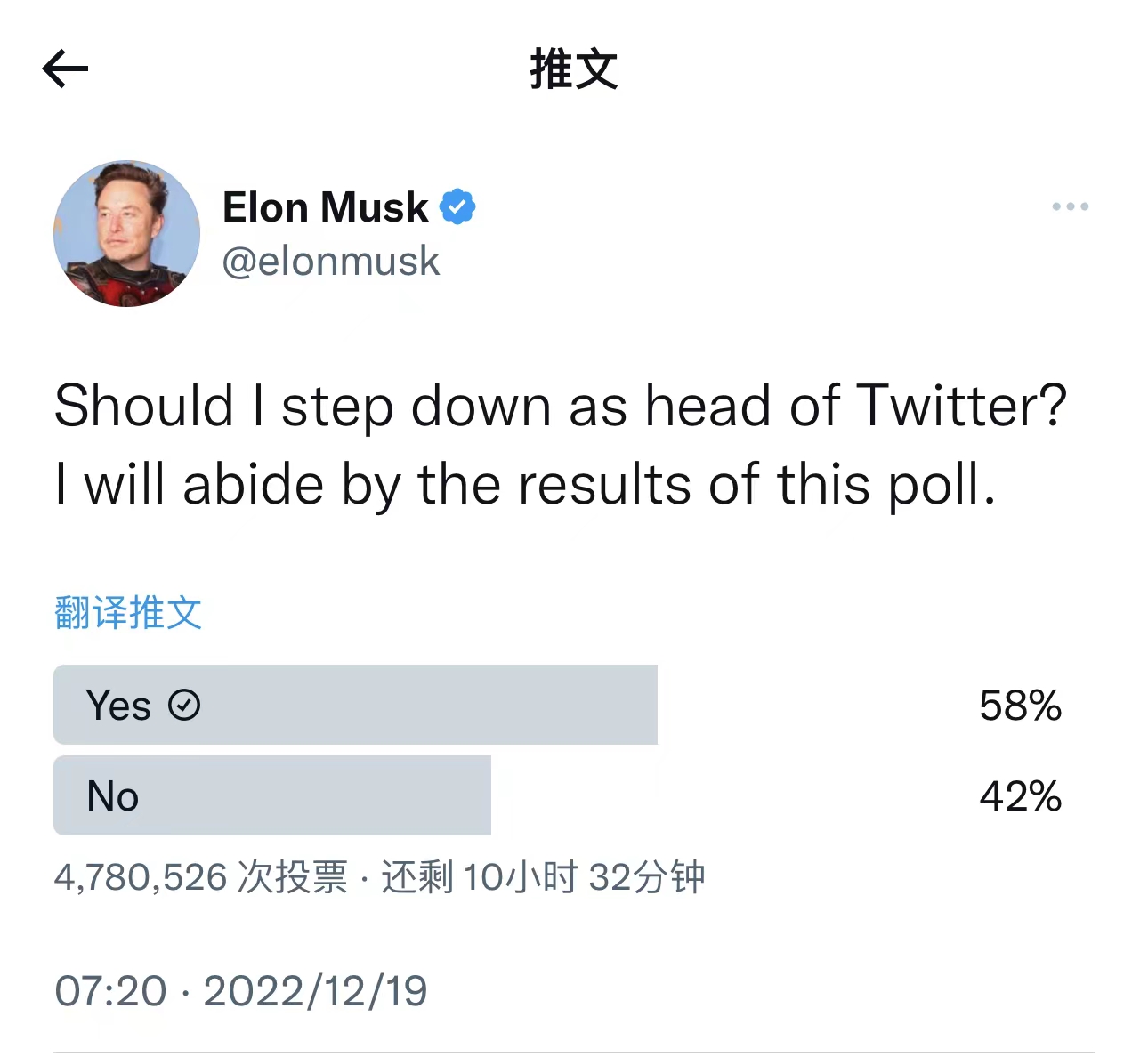 12月19日,推特CEO埃隆·马斯克发推文:我应该辞去推特负责人职位吗?我将遵守投票结果。在该推文下,网友可以参与投票,选择“Yes”或“No”。