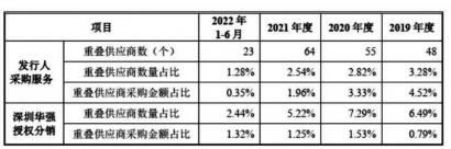 数据显示,2019年至2021年及2022年上半年,华强电子网与深圳华强重叠客户数量分别为187个、212个、299个、240个,重叠客户收入占公司总收入的比例分别为 18.19% 、 19.43% 、 19.88% 、14.27%。金融投资报记者注意到,歌尔股份2020年是华强电子网授权分销(替深圳华强分销产品)业务的前五大客户。但到了2021年,歌尔股份就成了华强电子网全球采购服务下的前五大客户。同时,公司与深圳华强还存在着不少重叠的供应商,重叠供应商数量分别为48个、55个、64个、23个。