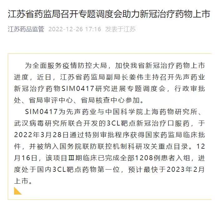 据“江苏药品监管”,江苏省药监局召开先声药业新冠治疗药物SIM0417研究进展专题调度会。
